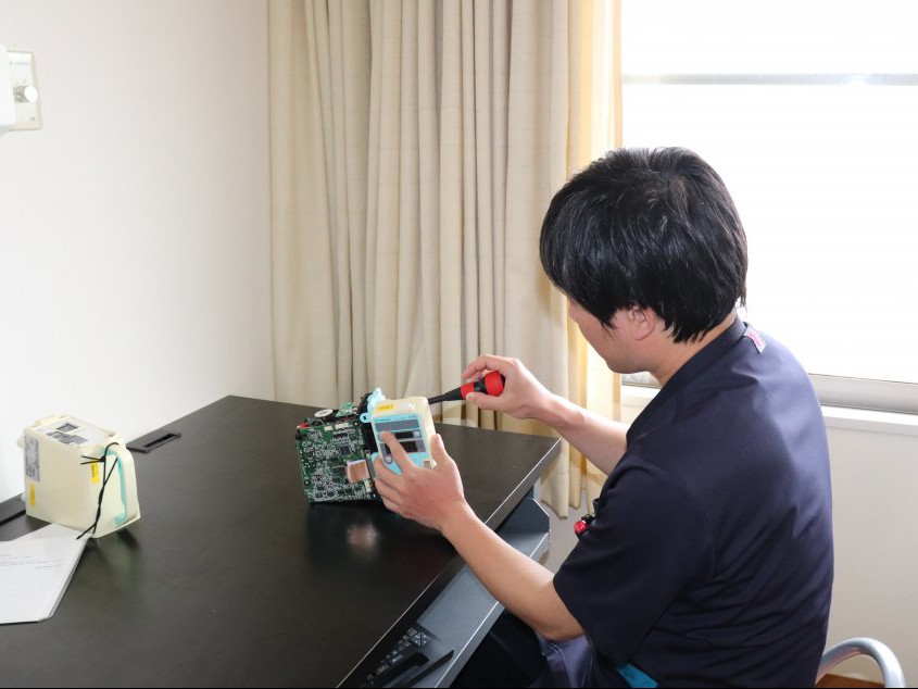 院内で使用されている医療機器のメンテナンスを行っています。また、医療機器の修理も、メーカーより講習を受け可能な限り院内で修理を行い現場への早期返却ができるよう努めています。