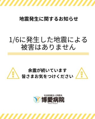 お知らせ 一覧はこちら 重要なお知らせ 2026.01.06 地震発生による被害はありません 令和8年1月6日10時18分頃に発生した地震による被害はありません。 地震発生直後に診療・検査・手術を一部中断しましたが、現在は再開しております。 明日からも通常通りの診療をいたします。 ←前の記事へ 次の記事へ→ お知らせ